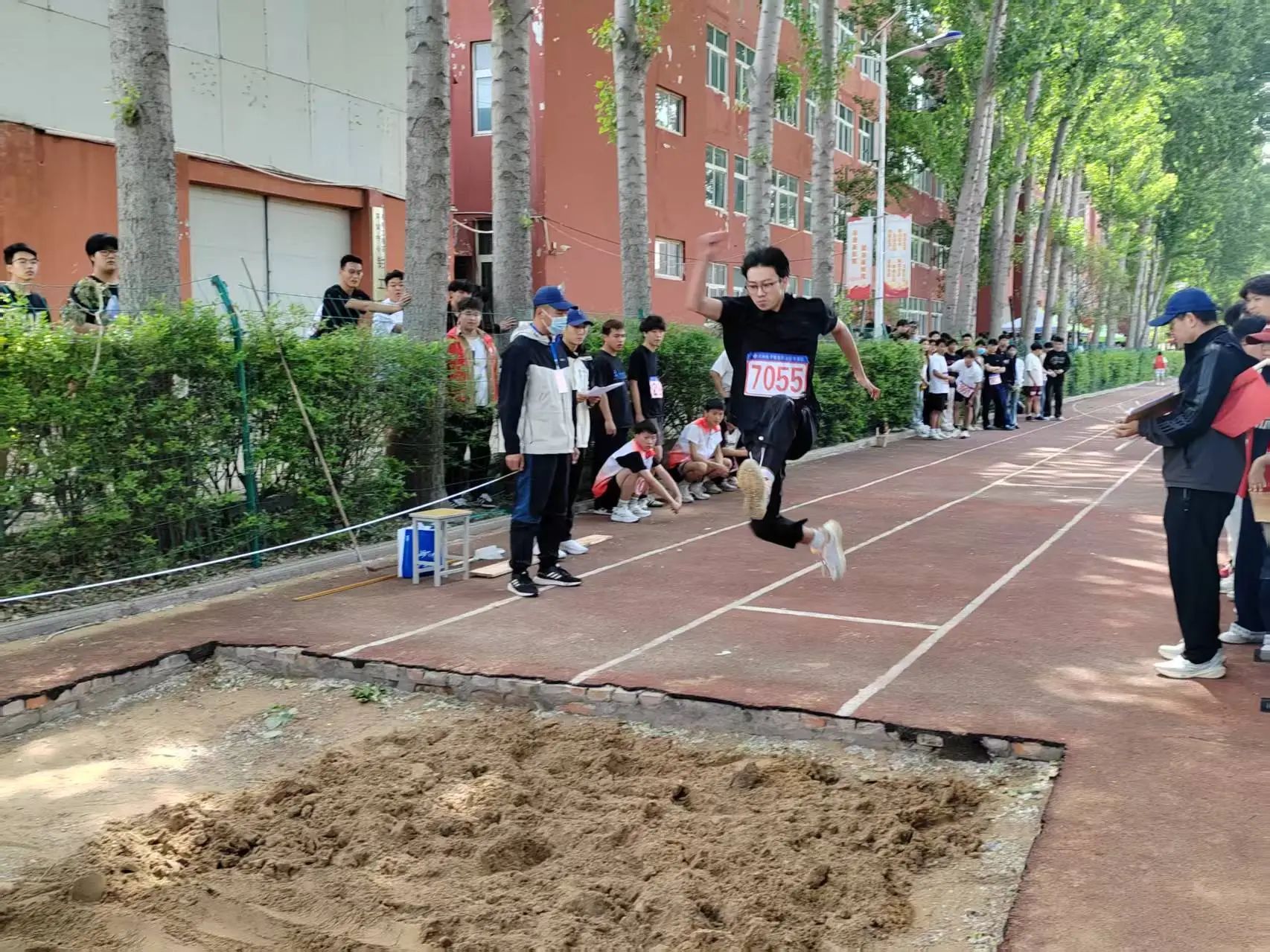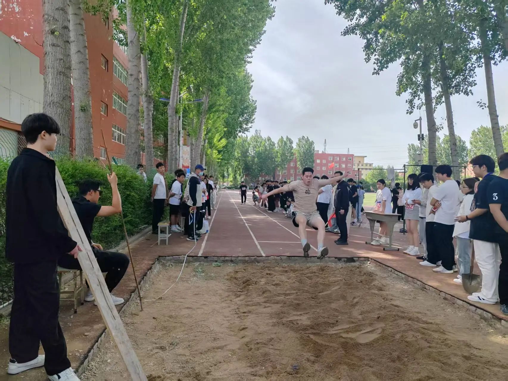 跳遠場上運動健兒們化身騰空飛燕。擺臂、蹬地、起跳!剎那間身體一躍而起,落地瞬間沙粒飛濺,我們在空中劃出了條條優(yōu)美的拋物線。丈量的卷尺越來越遠,我們的勁頭越來越足!
