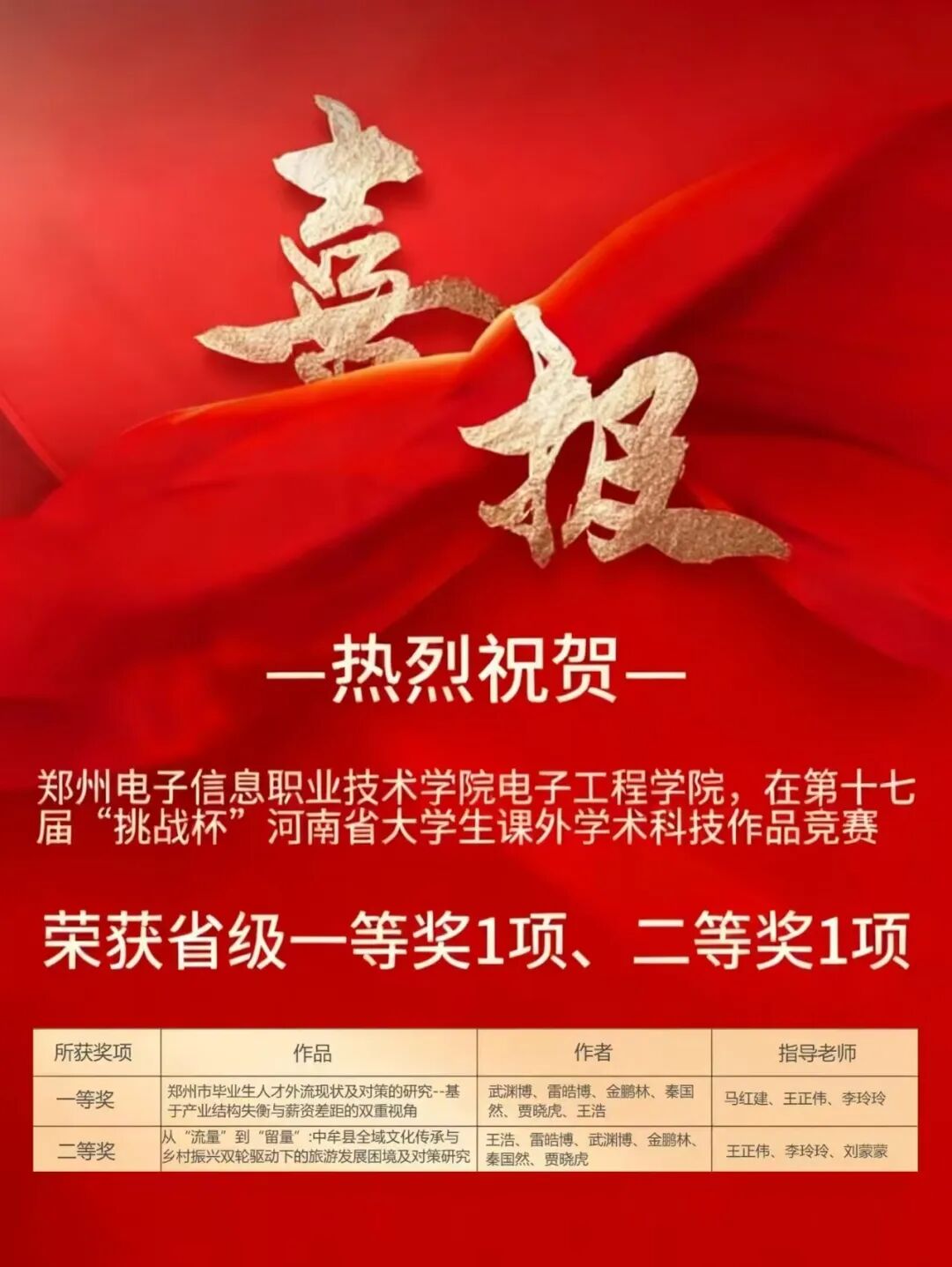 在河南省第十七屆 “挑戰(zhàn)杯” 河南省大學(xué)生課外學(xué)術(shù)科技作品競賽中,電子工程學(xué)院學(xué)子表現(xiàn)卓越,實現(xiàn)學(xué)校在省“挑戰(zhàn)杯”競賽中零的突破。填補了空白,開創(chuàng)了歷史。電子工程學(xué)院將繼續(xù)加大對學(xué)生科技創(chuàng)新活動的支持力度,鼓勵更多學(xué)生參與到各類高水平學(xué)科競賽中,培養(yǎng)更多具有創(chuàng)新精神和實踐能力的高素質(zhì)人才,為推動科技創(chuàng)新發(fā)展貢獻力量 。