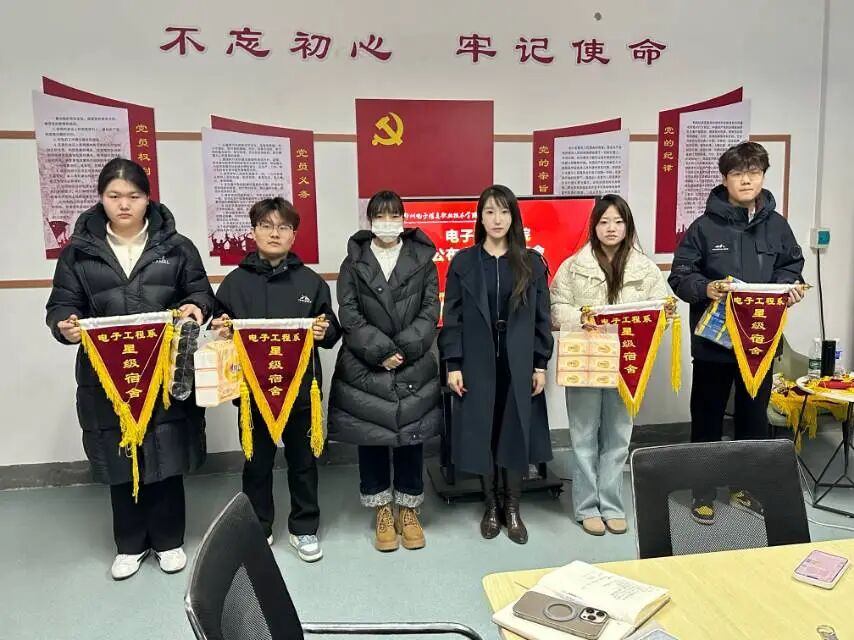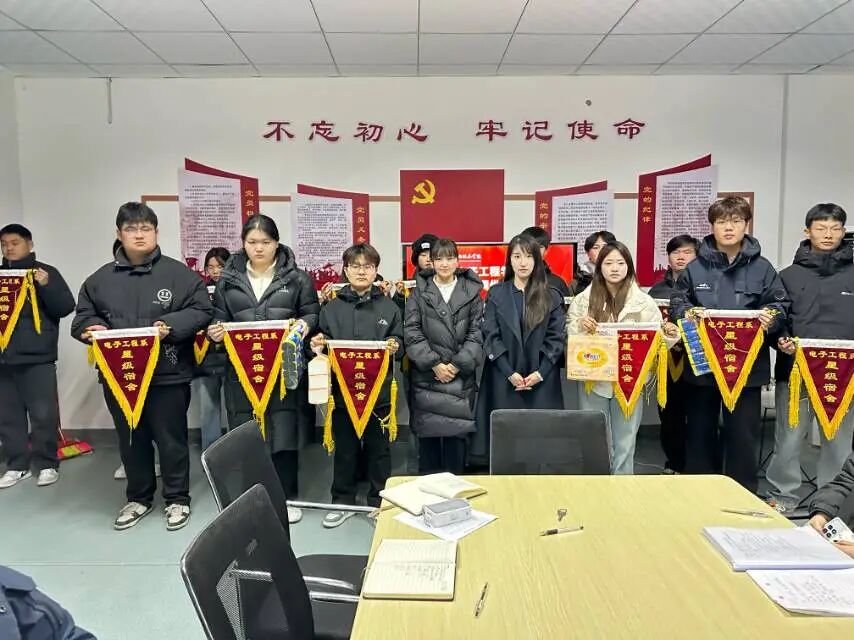 為不斷進(jìn)一步增強(qiáng)電子工程學(xué)院學(xué)子們的衛(wèi)生意識(shí)和文明素養(yǎng),展現(xiàn)良好的校園形象,電子工程學(xué)院于2025年12月15日開(kāi)展了“流動(dòng)紅旗”評(píng)比活動(dòng)。其中黨總支書(shū)記李玲玲、輔導(dǎo)員代表梁哲老師對(duì)優(yōu)秀宿舍頒發(fā)流動(dòng)紅旗,各班級(jí)班長(zhǎng)、團(tuán)支書(shū)、學(xué)院生活部參與本次頒發(fā)儀式。