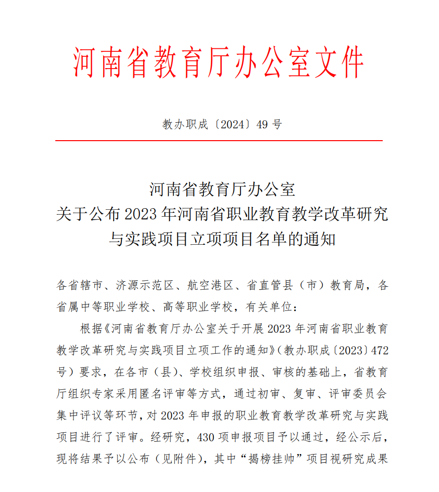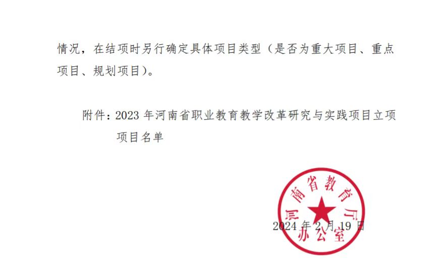 據(jù)《河南省教育廳辦公室關于開展 2023 年河南省職業(yè)教育教學改革研究與實踐項目立項工作的通知》(教辦職成〔2023〕472號):