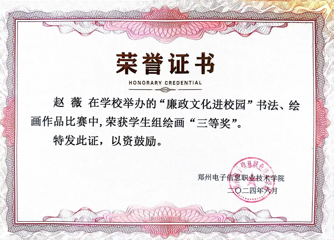 為認(rèn)真貫徹落實(shí)黨的二十大精神、二十屆中央紀(jì)委三次全會(huì)精神和習(xí)近平總書(shū)記關(guān)于黨紀(jì)學(xué)習(xí)教育的重要講話和重要指示精神,增強(qiáng)黨員干部紀(jì)律意識(shí),教育引導(dǎo)黨員干部學(xué)紀(jì)、知紀(jì)、明紀(jì)、守紀(jì),以及引領(lǐng)清廉學(xué)校創(chuàng)建行動(dòng),弘揚(yáng)清廉的校園文化。由中共鄭州電子信息職業(yè)技術(shù)學(xué)院紀(jì)律檢查委員會(huì)主導(dǎo),面向全校師生開(kāi)展以“廉政文化進(jìn)校園”書(shū)法、繪畫(huà)作品競(jìng)賽及“建設(shè)清廉學(xué)校、弘揚(yáng)清廉風(fēng)韻”征文比賽。
