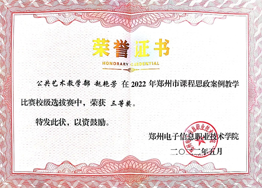 公共藝術(shù)教學(xué)部積極開展了課程思政創(chuàng)新大賽的初賽,經(jīng)學(xué)校評審組評審,我校公共藝術(shù)教學(xué)部教師趙艷芳老師獲一等獎(jiǎng),并推薦參加省級比賽。