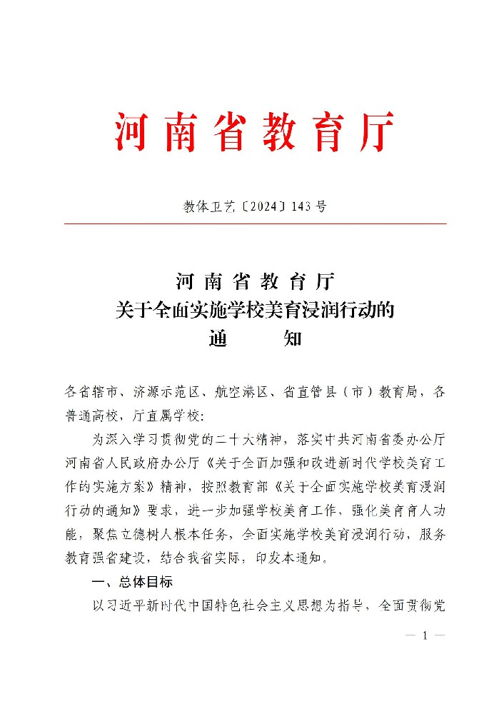 河南省教育廳關于全面實施學校美育浸潤行動的通知